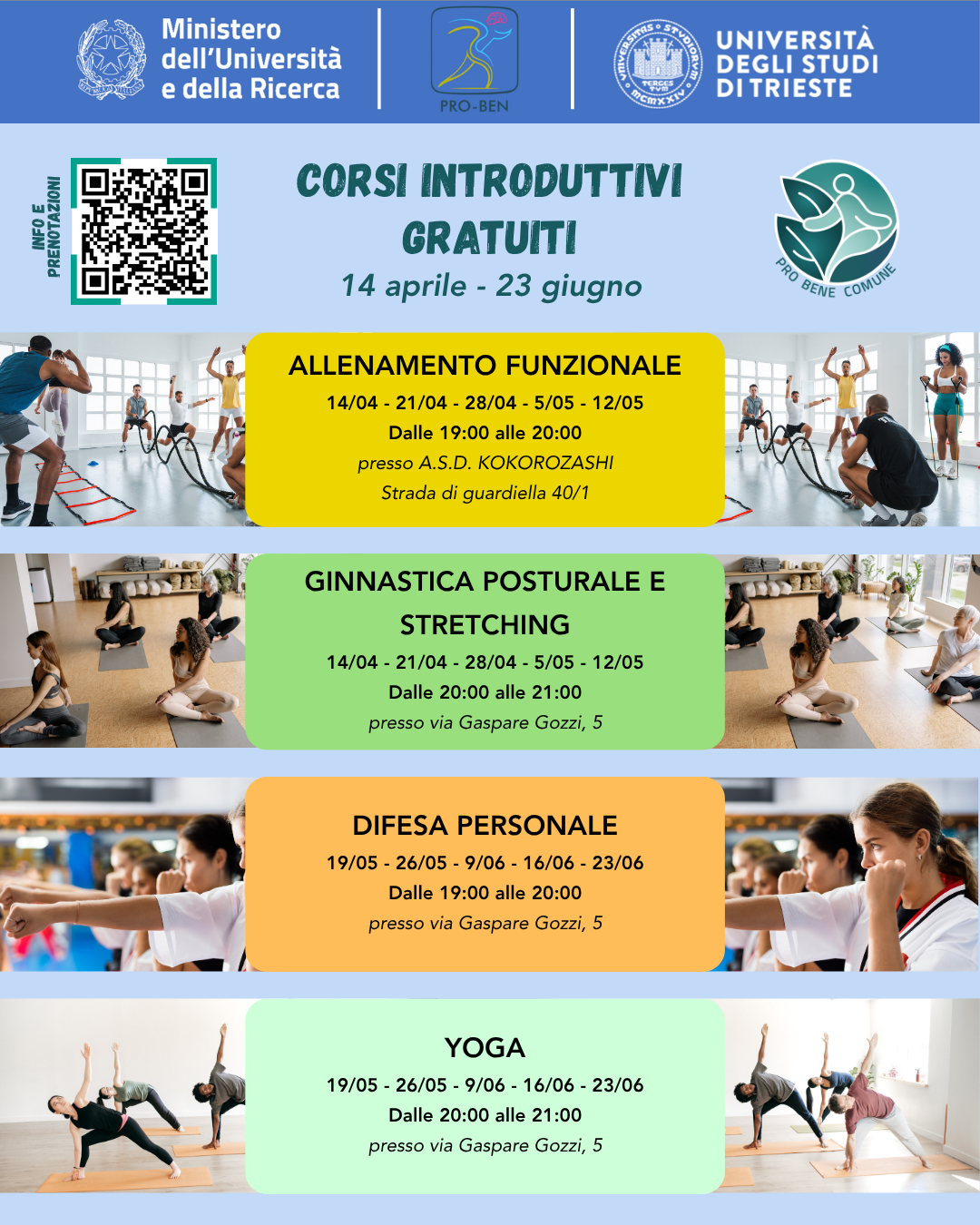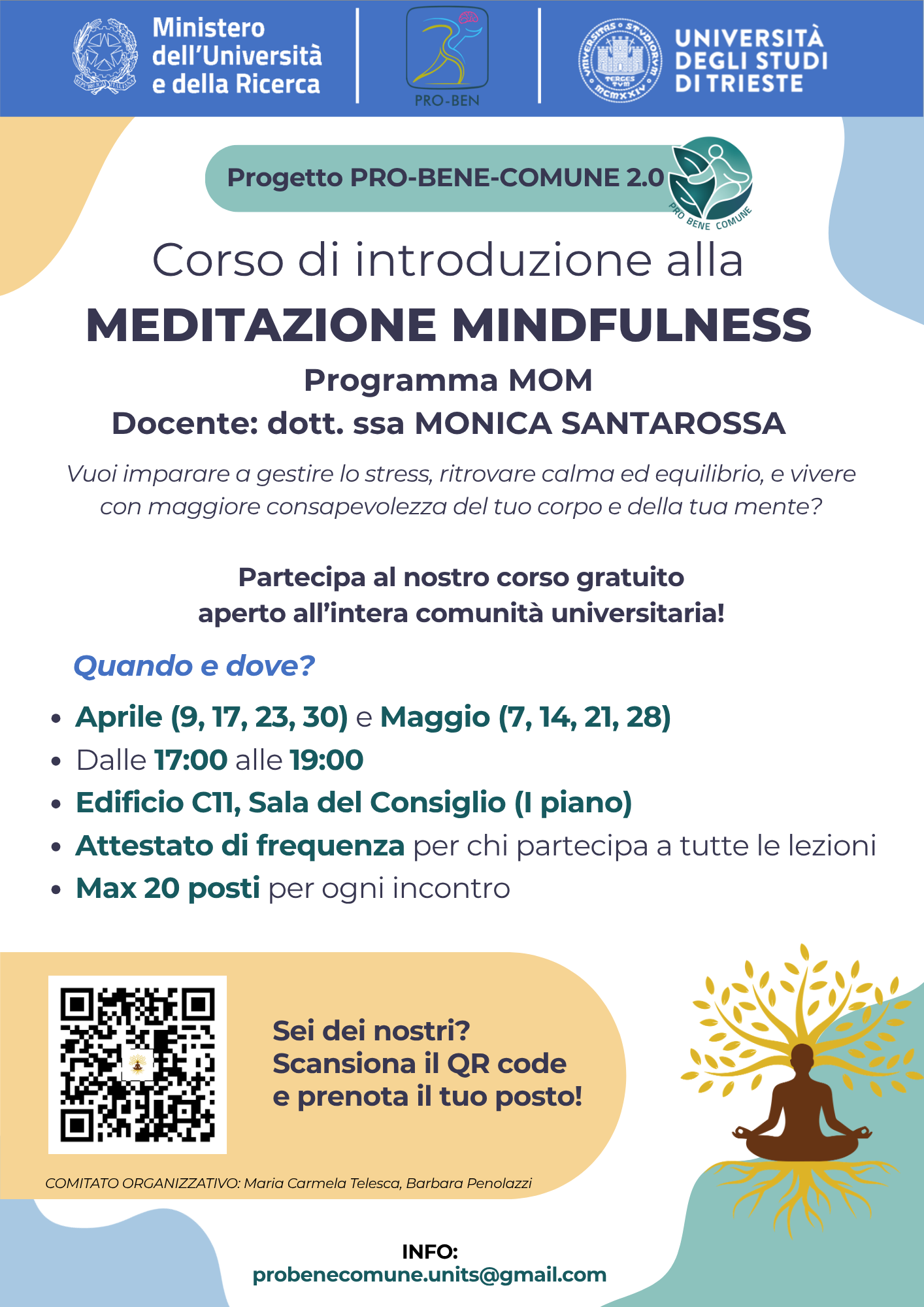 Agli incontri informativi (non è necessario essere presenti a tutti, in quanto le informazioni principali saranno fornite a ogni incontro) seguirà un corso gratuito e aperto all’intera comunità universitaria (studenti e studentesse, docenti, personale tecnico-amministrativo etc.) e si comporrà di 8 incontri totali, ciascuno della durata di 2 ore (17:00-19:00) presso la Sala del Consiglio dell'Edificio C11 in via Giorgeri, 1 nei mesi di aprile e maggio 2026.