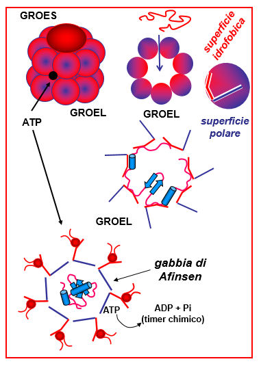 - La transizione conformazionale sposta anche le superfici idrofobiche che foderavano l’interno del poro, che adesso diventa idrofilico. La catena polipetidica substrato viene quindi rilasciata nella cavità interna (lumen) del poro, la cosiddetta “Gabbia di Afinsen”, dove gli è permesso di ripiegare un ambiente completamente protetto.