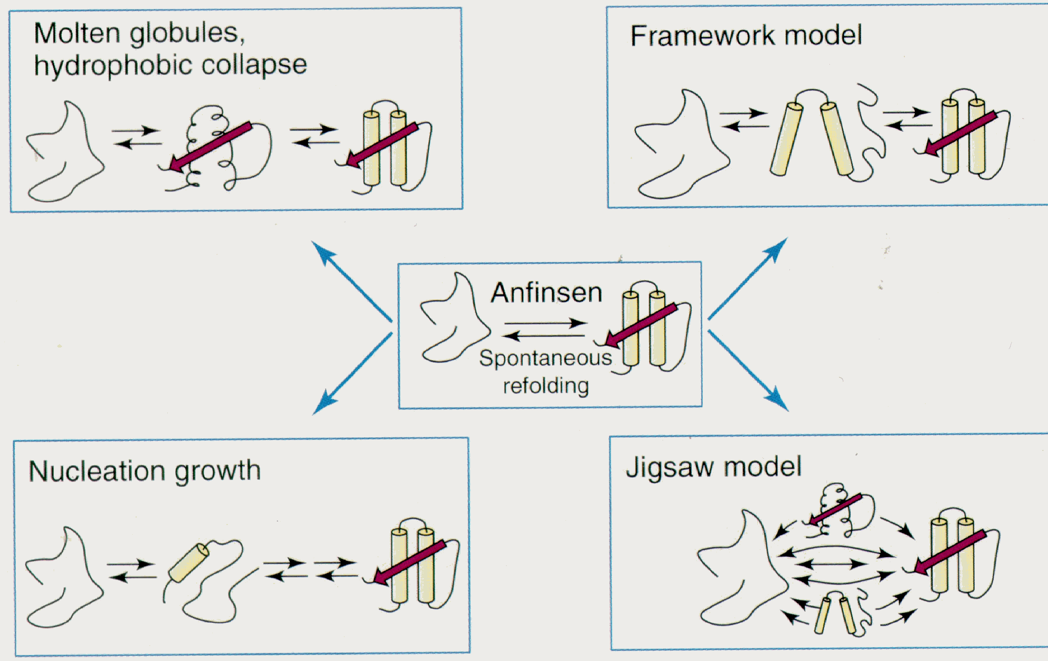 1) Per piccole proteine, Anfinsen ha proposto che il ripiegamento avviene spontaneamente e direttamente alla struttura più stabile, che è quella nativa (Fig 4, centro). I residui idrofobici, in particolare, cercano di segregarsi all'interno della proteina per evitare l'ambiente acquoso. Per subunità proteiche con dimensioni maggiori, un altro modello per il folding propone che questa necessità promuove inizialmente il “collasso idrofobico” della catena estesa e non strutturata, con formazione del cosiddetto “globulo fuso” (tempo millisecondi). Questa è una struttura compatta anche se ancora disordinata e molto dinamica, nella quale i residui idrofobici sono rivolti verso l'interno e protetti dall'ambiente acquoso.