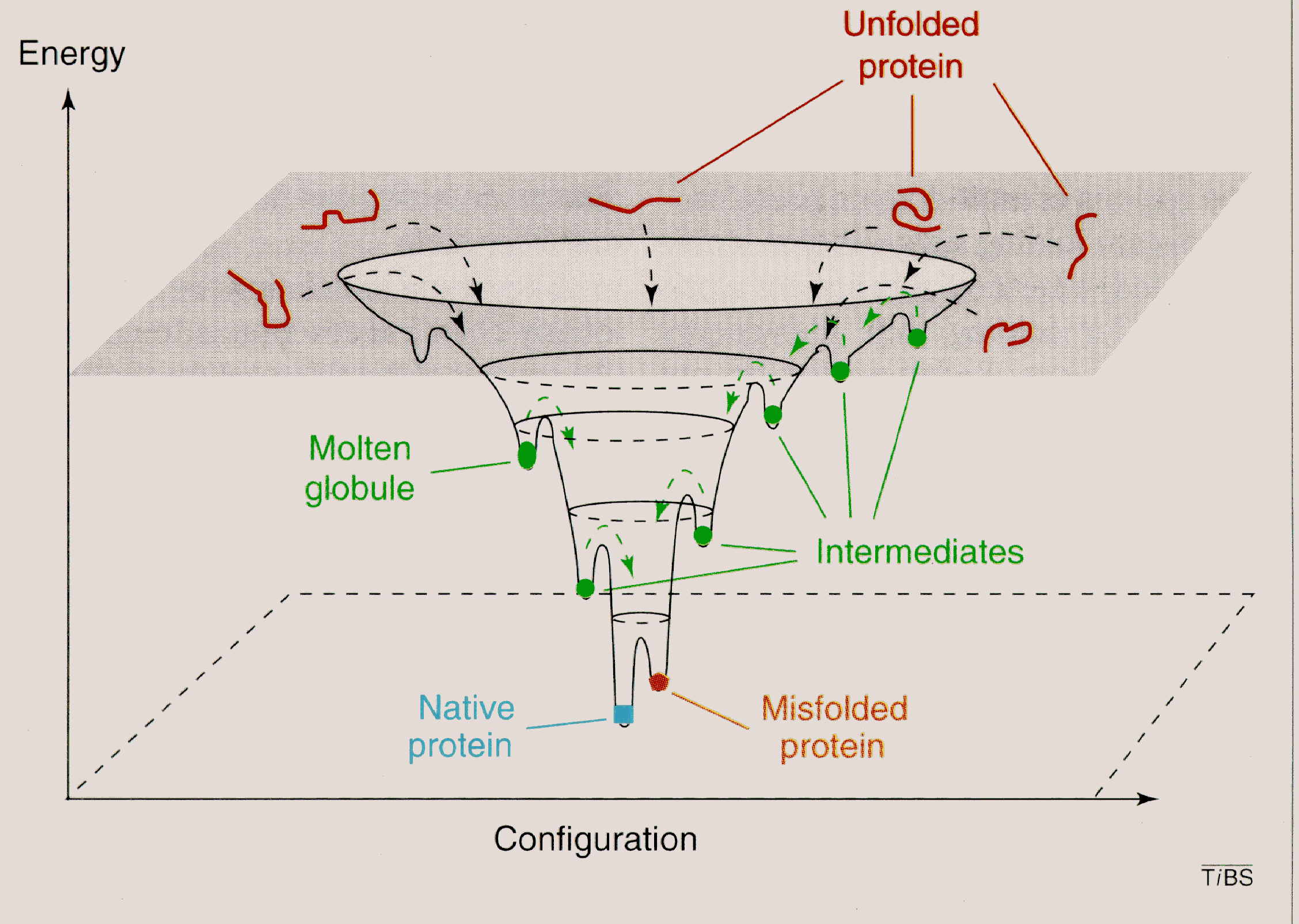 6) In conclusione, le catene proteiche non ripiegate hanno strutture disordinate in molte diverse maniere. In altre parole, coprono uno spazio conformazionale disordinato molto ampio, e hanno un elevato contenuto energetico. Questo si può schematizzare come il plateau ad alta energia nella Fig. 5. Quando iniziano a ripiegarsi, entrano in un cosidetto "folding funnel" una versione del 'panorama energetico molecolare' che presuppone che lo stato nativo della proteina corrisponde ad un minimo nell'energia libera. La parete di questo imbuto (cioè la traiettoria energetica seguita dalla catena durante il ripiegamento) può essere assai "accidentata". Sono presenti molti minimi energetici locali, che corrispondono a strutture non ‘native’ nei quali le catene parzialmente ripiegate possono 'intrappolarsi'. Da questi minimi escono sfruttando l’energia termica, oppure con l’aiuto di altere proteine (vedi sotto). La teoria del ‘folding funnel’ presume che lo stato nativo sia un minimo molto profondo, con pareti ripide, corrispondente ad una specifica e ben definita struttura terziaria, dal quale la catene non può uscire. Molte proteine, in assenza di aiuto da parte di altre proteine, predisposte per assistere il folding, entrerebbero in profondi minimi che corrispondono a strutture non-native, e queste 'misfolded proteins', oltre non essere funzionali, potrebbero essere dannose per l'organismo.